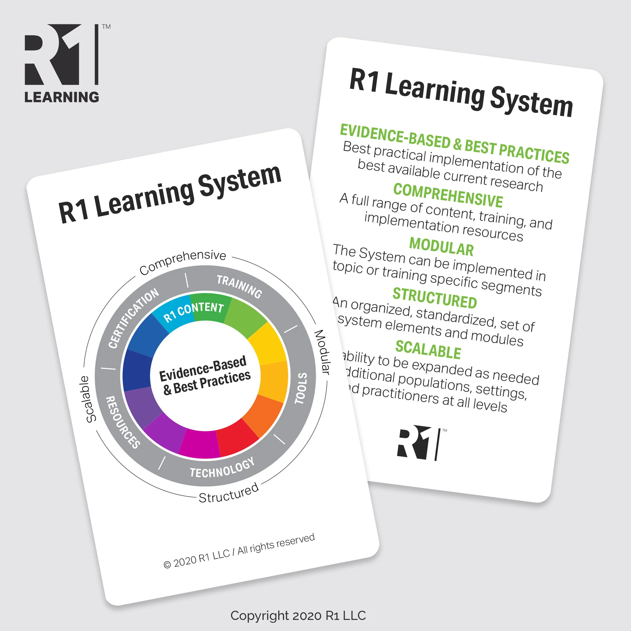 Scalable – The ability to be scaled or expanded as needed is an outcome of what we have covered thus far. This is a barrier for so many programs. The R1 Learning System gives programs and practitioners a way to replicate and implement our tools with different populations, in a variety of settings, and with practitioners at all levels of knowledge, skill, and experience. Given the turnkey nature of our resources, implementation, a once challenging or overwhelming prospect, becomes achievable. Scalability can be at multiple levels; adding additional topics over time, broadening to different populations, educating additional levels of staff, or expanding to a variety of locations.